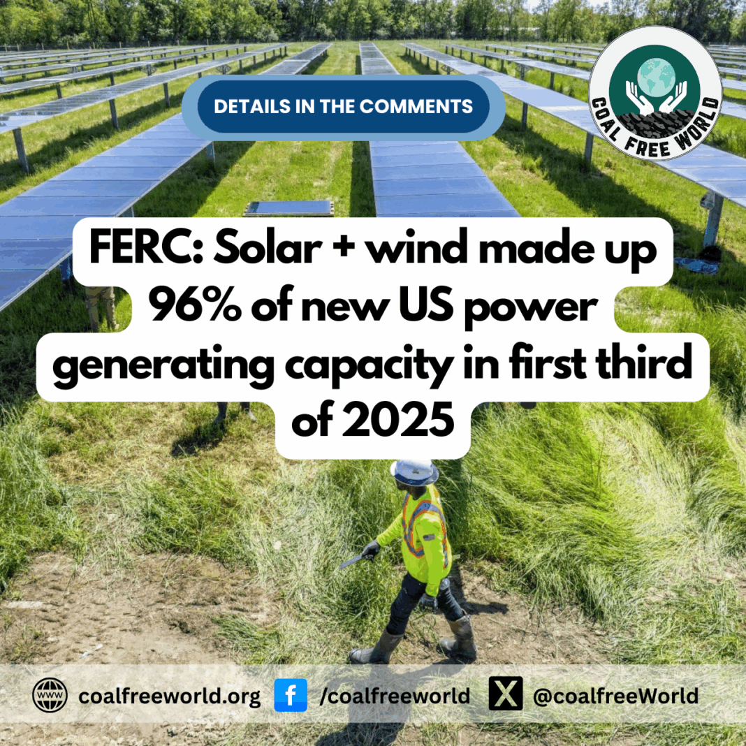 Solar and wind accounted for almost 96% of new US electrical generating capacity added in the first third of 2025. In April, solar provided 87% of new capacity, making it the 20th consecutive month solar has taken the lead, according to data belatedly posted on July 1 by the Federal Energy Regulatory Commission (FERC) and reviewed by the SUN DAY Campaign.